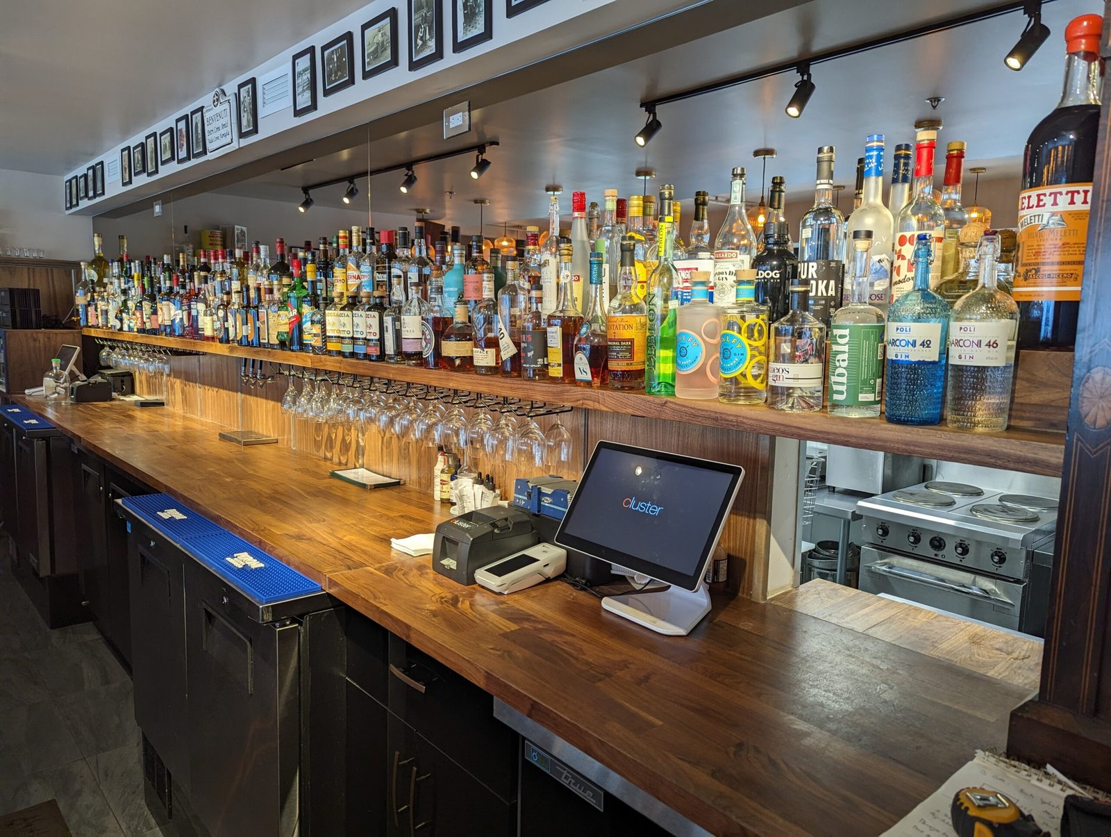 Une étagère sur mesure derrière le bar pour un accès facile aux bouteilles.