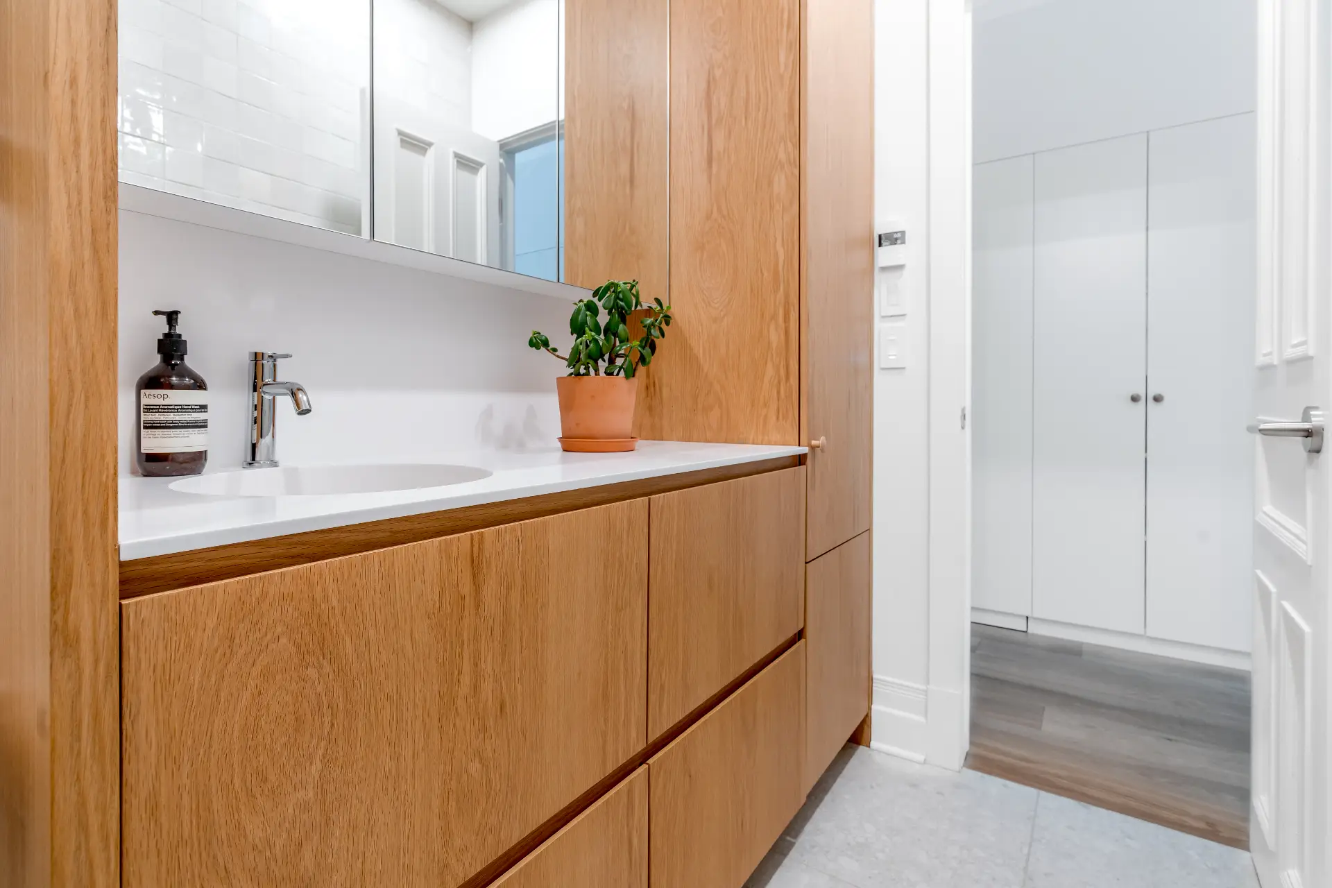 Des meubles-lavabos sur mesure aux solutions de rangement intégrées, nos projets de salles de bains sont conçus pour transformer votre espace en un havre de paix raffiné. Nous privilégions l’optimisation de la fonctionnalité sans sacrifier l’élégance, en veillant à ce que chaque armoire et étagère soit résistante à l’humidité et conçue pour durer. Que vous recherchiez une esthétique épurée et moderne ou une ambiance chaleureuse et traditionnelle, nous travaillons en étroite collaboration avec vous pour créer un environnement sur mesure qui allie un design sophistiqué aux exigences pratiques de votre quotidien.